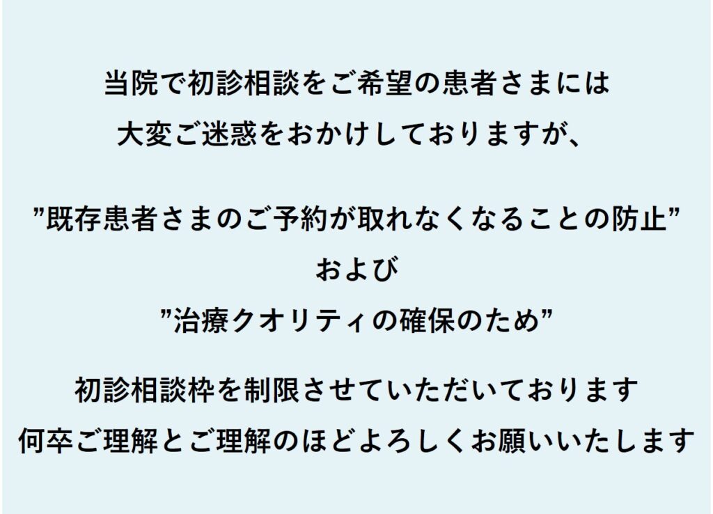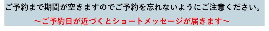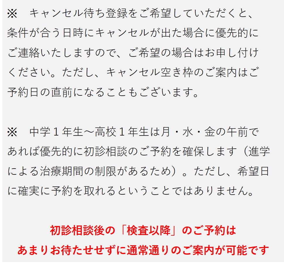 初診相談のご予約でも当日キャンセルや前日キャンセルのご連絡をいただくことがありますが、その場合は一からご予約を取っていただくことになりますのでなるべくキャンセルがないように確実にご来院可能なご予約をお取りください。