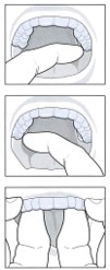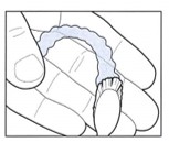 2、マウスピースは上下顎、どちらから先に装着しても構いませんが、マウスピースを付けるときは指の腹でゆっくり、できるだけ均一に力を加えてください。