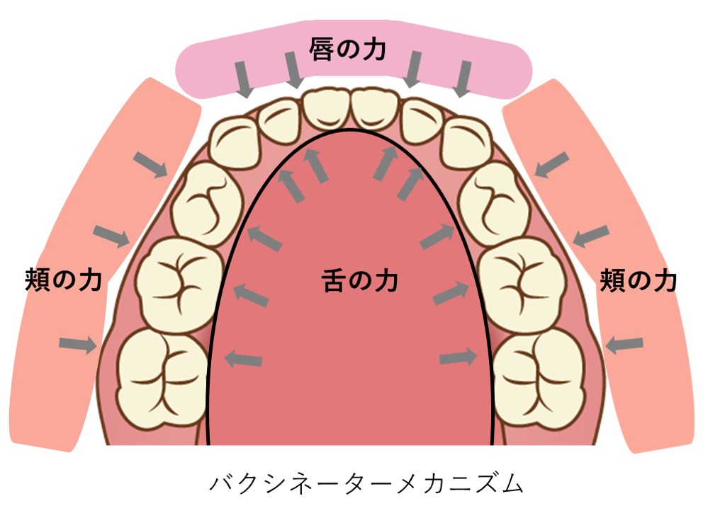 歯の外側には唇や頬が、内側には舌があります。本来、その均等が取れた場所に歯が並んでいき、自然にかみ合わせを維持することになります(左図参照:バクシネーターメカニズム)。