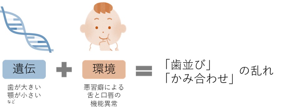 歯並びやかみ合わせが悪くなる原因には様々な要因があります。大きく分けると遺伝の「先天的要因」と環境の「後天的要因」の2つがあります。