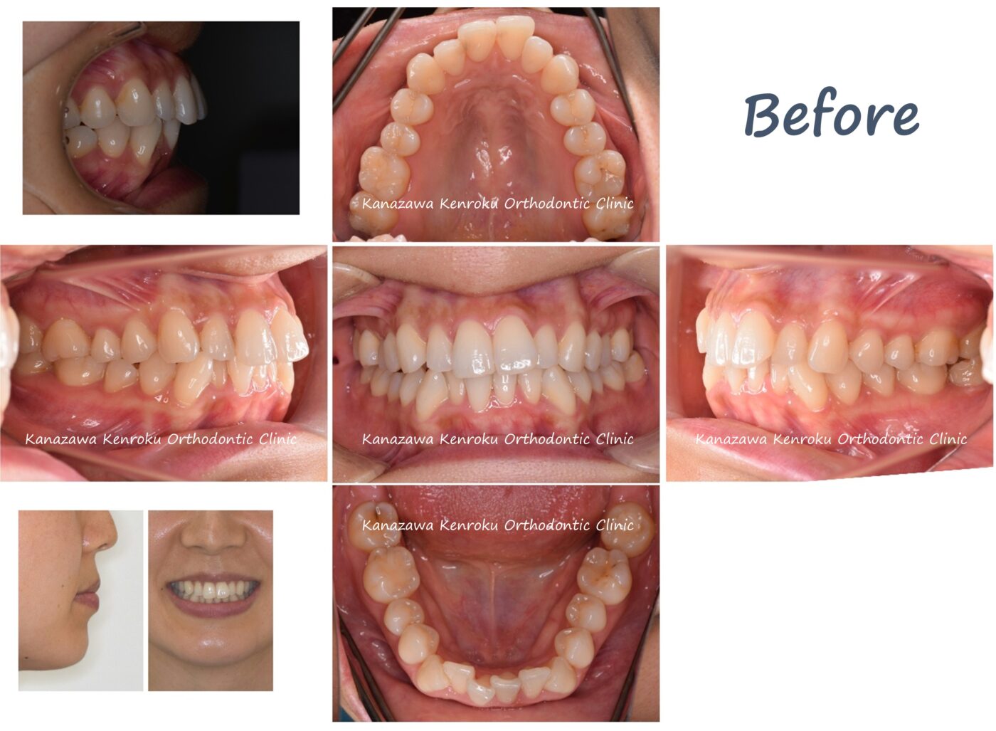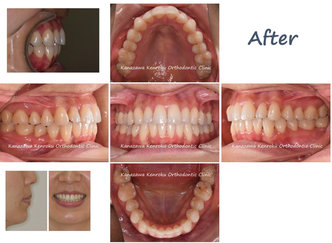 叢生を非抜歯で改善したケースです。初診時に側貌には問題を認めなかったので、叢生の量を考慮して非抜歯での治療が可能と判断しました。ただし叢生量が多く、そのままIPR(歯を削って歯の幅を縮小する方法)だけで治そうとすると、削る量が多くなってしまうこと、および犬歯の歯根が骨から逸脱する可能性があると判断しました。そこで、上下顎臼歯を後方移動させることで前歯部にスペースを設け、そのスペースを利用して前歯部を排列する方針としました。全体的に奥歯を移動させるために治療期間が長くなってしまいましたが、歯を削合する量を減らすことができ、かつ犬歯の歯根も真っ直ぐに立て直すことでき、きれいなアーチをつくることができました。