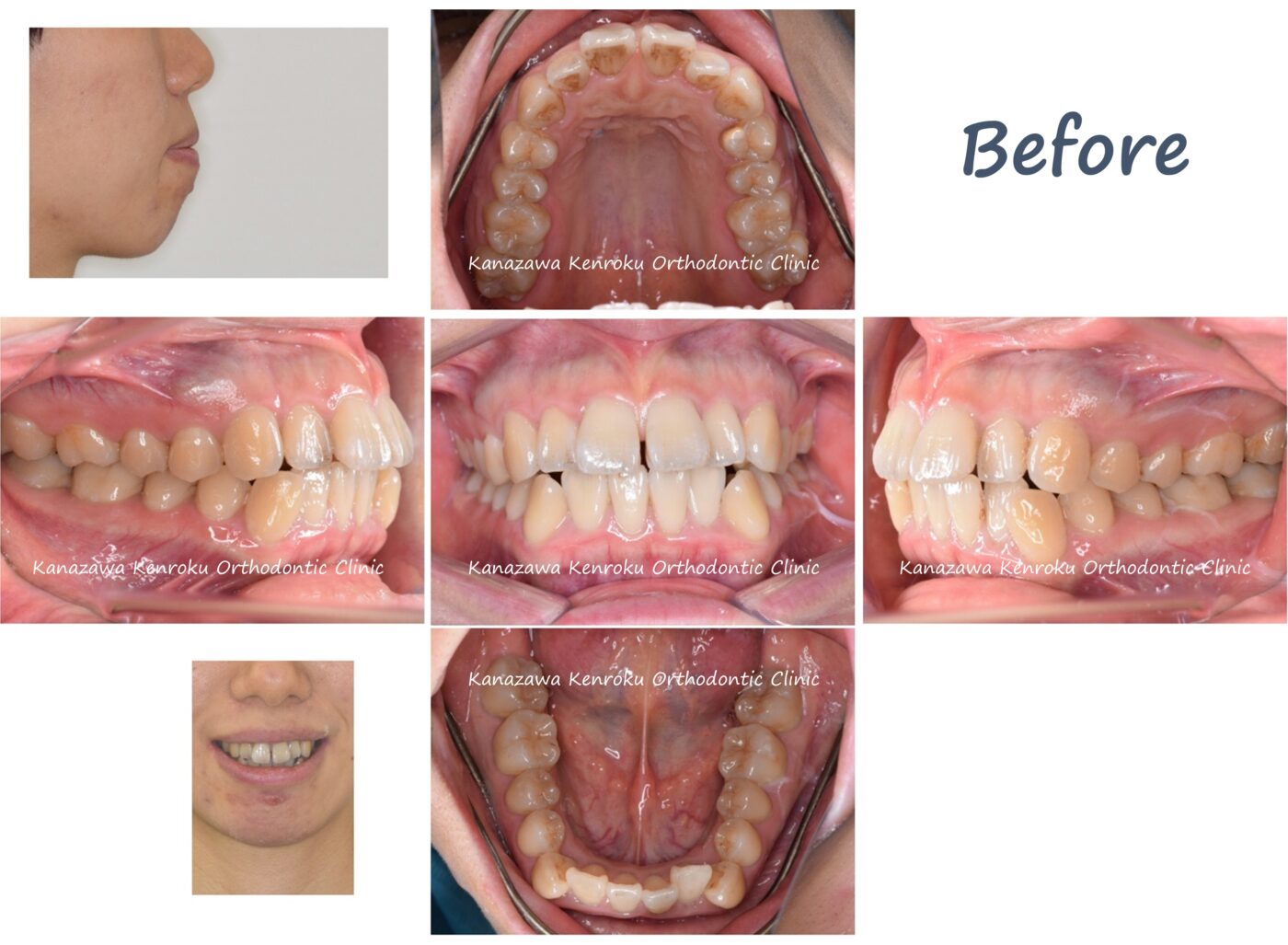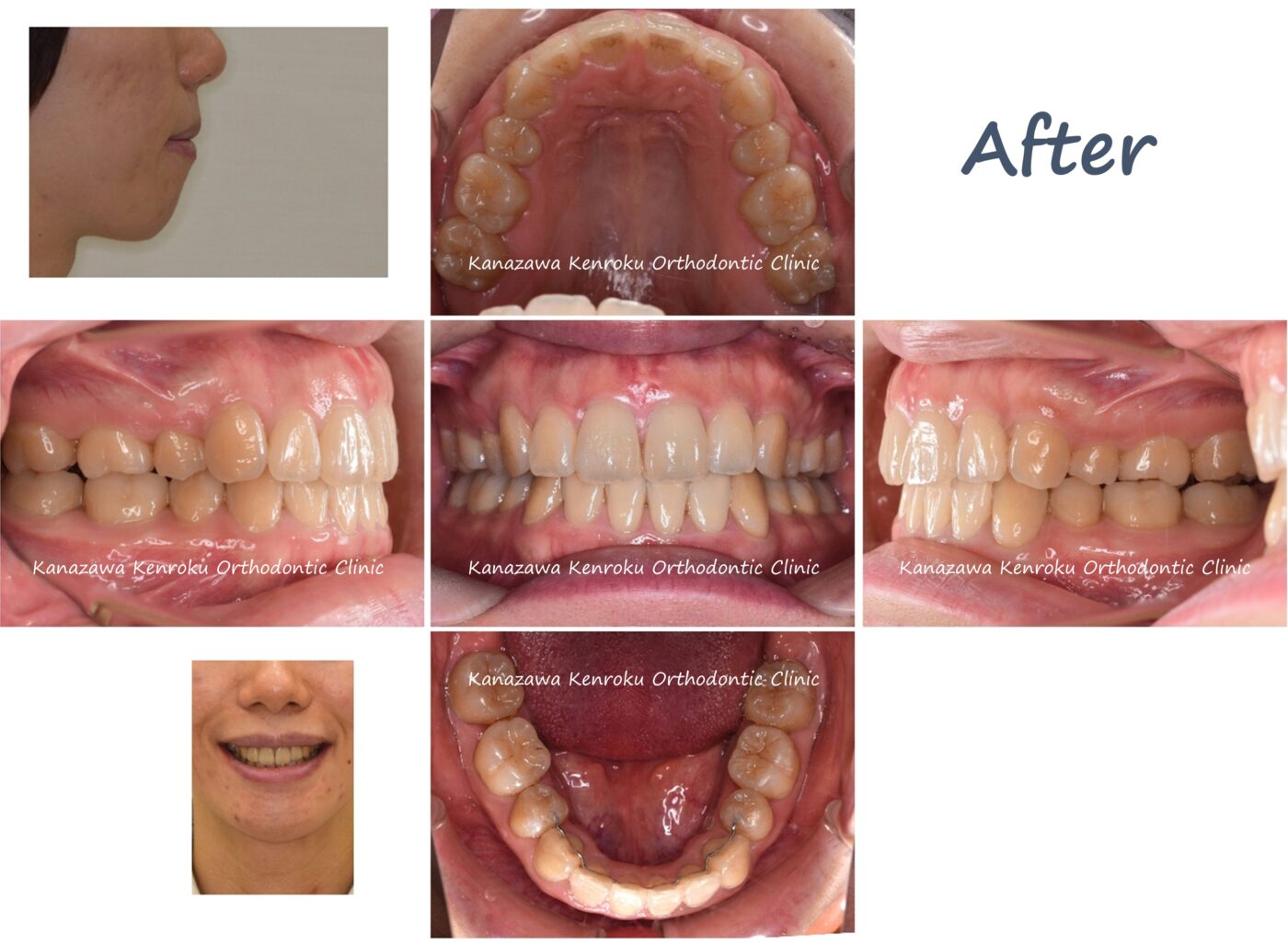 上下顎前突(いわゆる口ゴボ)のケースです。上下顎前突の患者さまは、口の閉じにくさを主訴とする場合も多く、基本的には上下左右の歯を1本ずつ計4本抜歯して治療を行います。歯を抜くことで前歯を引っ込めるスペースを確保し、歯並びだけではなく横顔を含めて整えることになります(逆に言うと上下顎前突では歯を抜かなければ横顔は治りません)。上下顎前突の場合、舌のトレーニングや顎間ゴムの使用協力がとても重要です。今回のケースでは、少し治療期間が長くなってしまいましたが、上下顎前歯の後退を十分に行うことができて側貌も改善しております。やや顎先の緊張感が残っていますが、これは骨格のずれに起因するため矯正治療ではこれが限界と言えるでしょう。なお、無理やり前歯の後退量を多くすると、ほうれい線が深くなるリスクもあります。また上唇小帯高位付着も認め、矯正治療中に切除術を行っていただきました。上唇小帯高位付着があると正中離開(前歯の開き)が生じ、切除していないと治療後も前歯の開きが再発する可能性があるため、よほど嫌でなければ切除術を勧めています。※ 歯の色はテトラサイクリン歯の可能性があります。