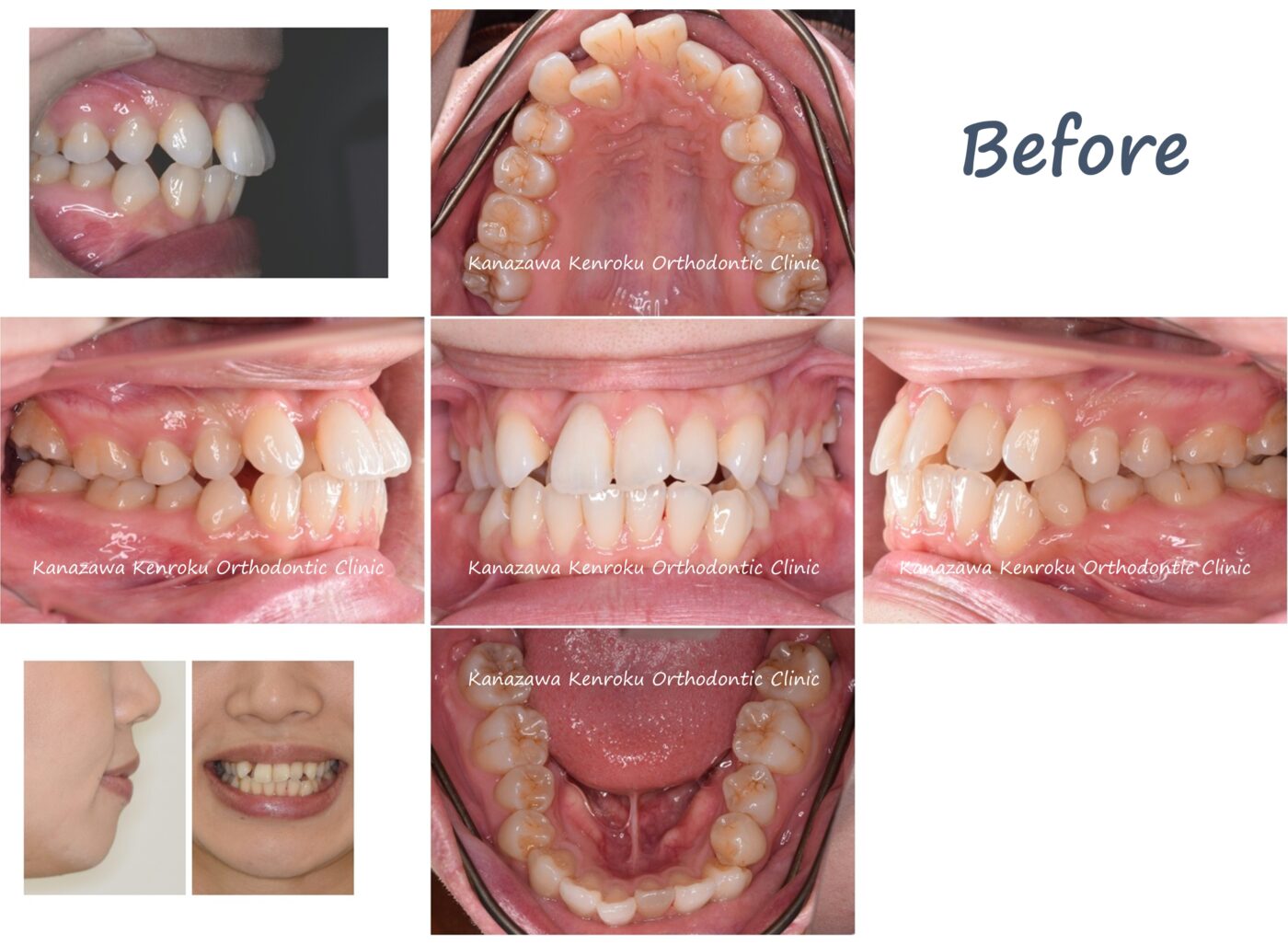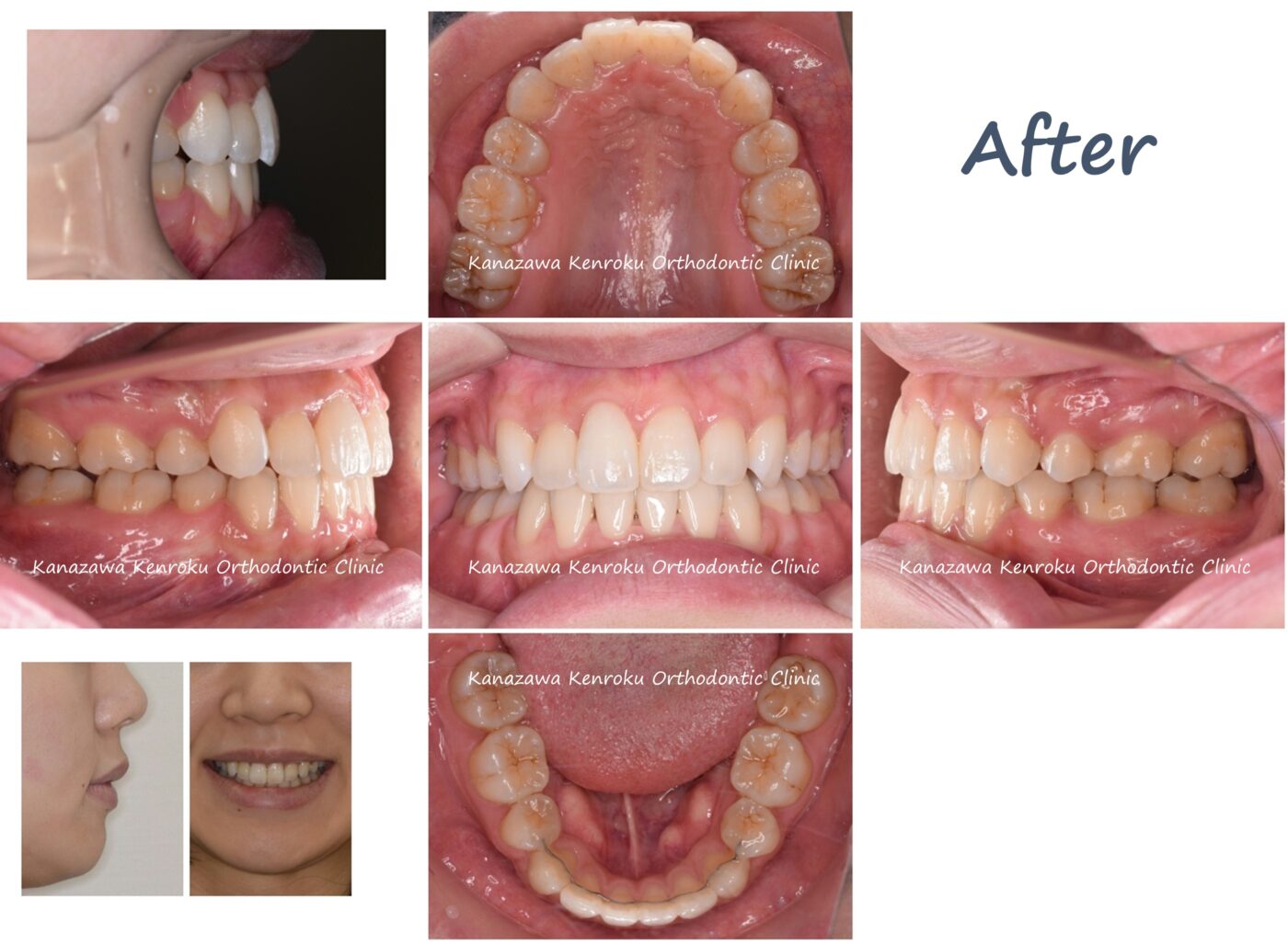 叢生を主訴にご来院されましたが、検査結果より上下顎前歯の前傾を認め、かつ口の閉じにくさもあったことから、小臼歯4本を抜歯して叢生の改善と前歯の後退による口唇閉鎖の改善・側貌の改善を行いました。右上の中に入ってしまっている歯の移動量が多く、歯髄壊死のリスクの高い歯であったことから慎重に治療を進めました。やや治療期間が長くなりましたが、良好な歯列・咬合を獲得しています。