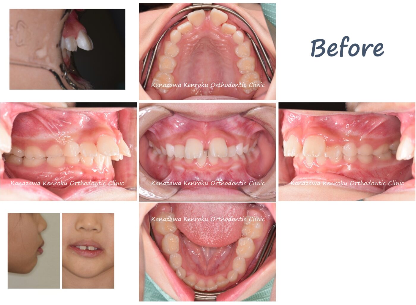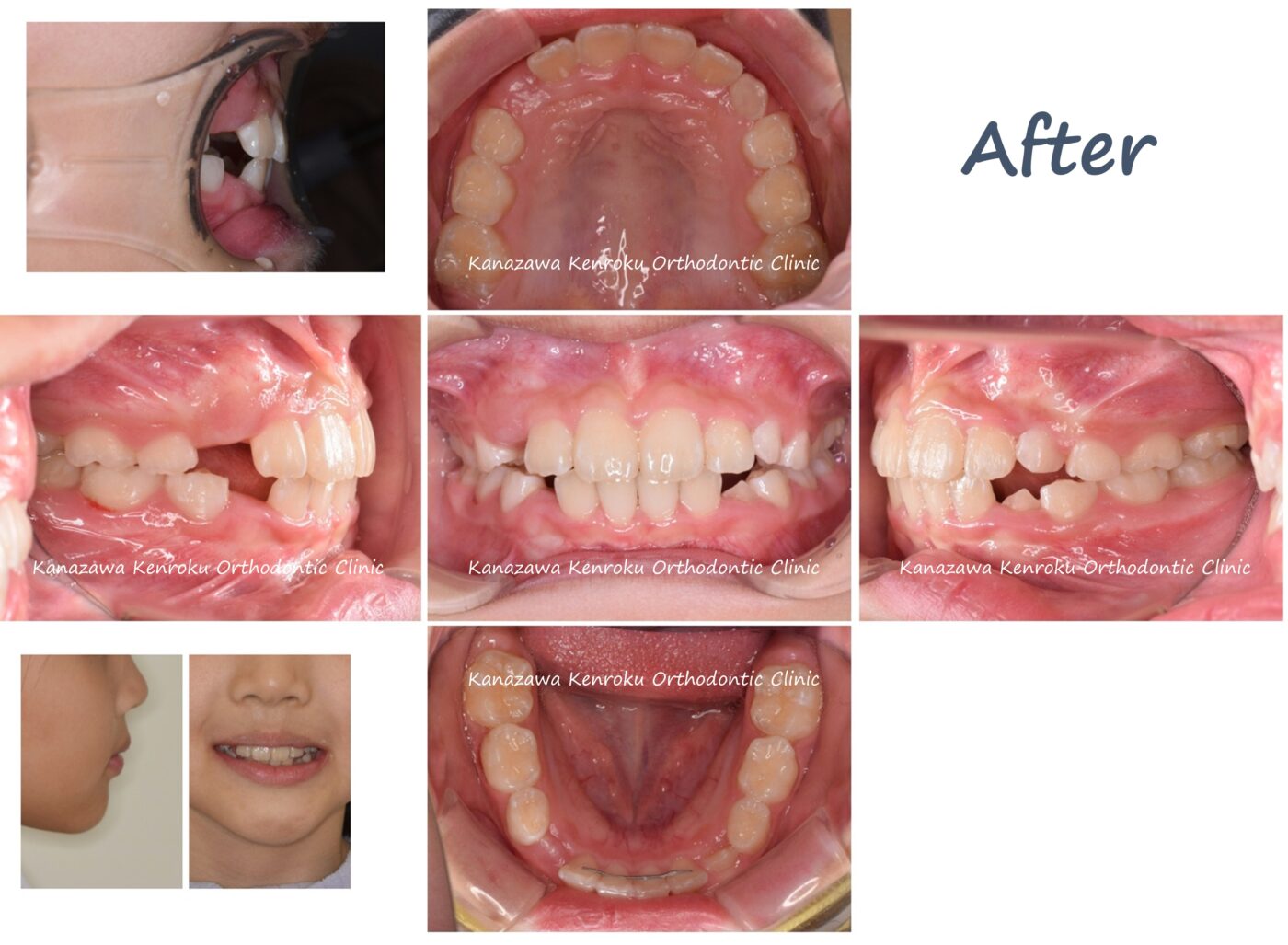 出っ歯(上顎前突)を主訴にご来院されました。前突の程度が重度であり、下顎の前歯が上顎の歯肉に当たっているような状態でした。当院では、小児矯正のためのマウスピース矯正装置の治療実績が豊富なため、マウスピース矯正装置をお勧めさせていただき、マウスピース矯正にて治療を行うこととなりました。自分でひっかける顎間ゴムという輪ゴムの使用協力が非常に重要でしたが、しっかりご協力いただけたことでスムーズに治療を進めることができました。