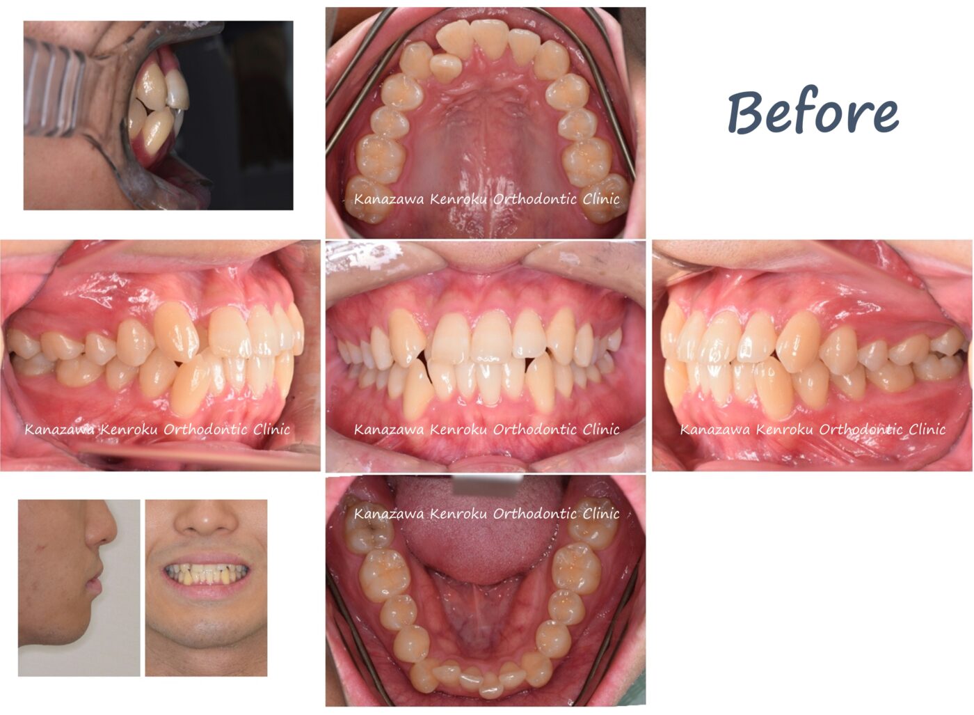 上下顎に叢生(でこぼこ)を認めました。歯を並べる骨に対してギュウギュウに歯が並んでいる状態であり、無理に「抜かない治療」をすると歯茎がさがってしまったり、非常に多く歯を削る処置が必要になってしまうことから、上下左右4本の小臼歯を抜歯する方針としました。20歳という若さを十分に活かすことができ、一般的には2年半ほどかかる4本抜歯の方針にも関わらず、1年6か月という短期間で治療が完了しました。