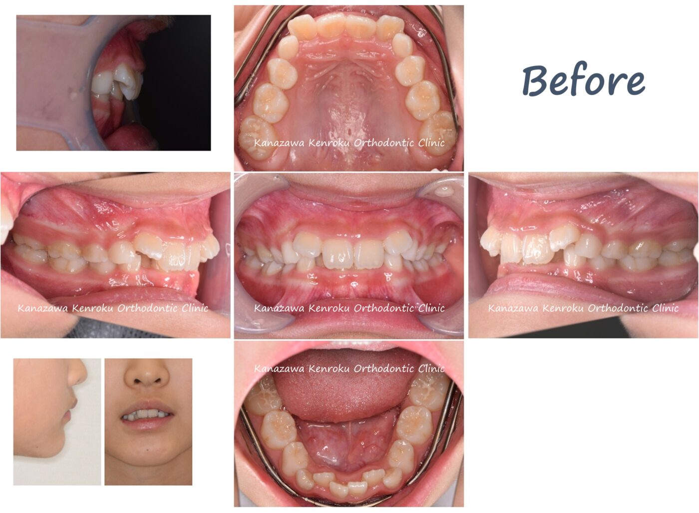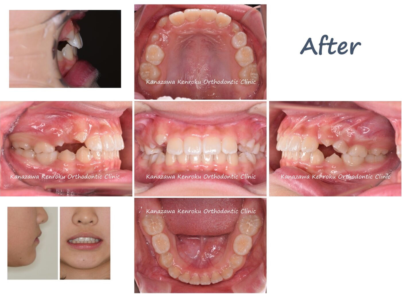 上から2番目の側切歯という歯がハの字で生えており、下顎前歯にもでこぼこを認めました。また、かみ合わせが深く、かみ合わせた時に下の歯が全く見えない過蓋咬合を呈していました。横顔には問題がなかったことから歯を抜かずに、永久歯の生え変わりもうまく誘導できると判断して、できる限り萌出誘導を行いました。治療期間は一期治療としてはやや長くなりましたが、永久歯が生えるスペースは確保することができました。ただ、右上犬歯がやや頬側から生えてきているため、場合によっては二期治療が必要になる可能性があります(気にしなければ無理に二期治療をするレベルではないでしょう)。
